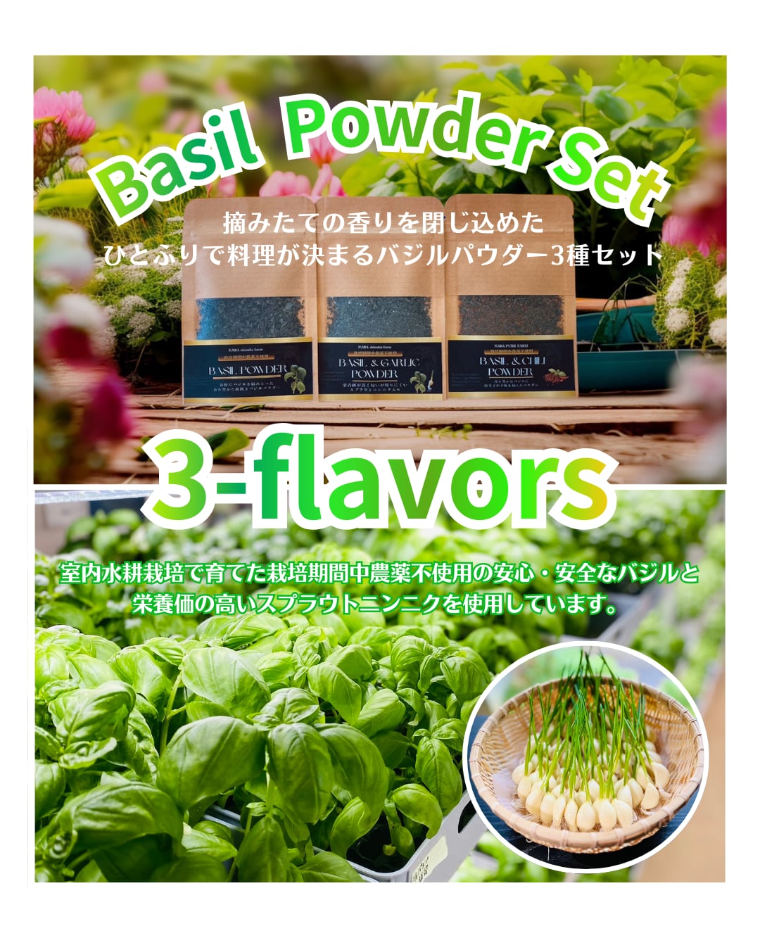 【Basil powder 3種セット】×3set ― 室内水耕栽培で育てた、安心と香りの新しいかたち ― 室内水耕栽培で栽培期間中農薬を一切使用せずに育てたバジル・スプラウトニンニクを丁寧に乾燥させ粉末にしました。 【Basil POWDER】5g フレッシュで香り高いバジルを摘み取り乾燥させたバジルパウダー 【Basil &SPROUT GARLIC】5g バジルにスプラウトニンニクをブレンドした香りとコク高いバジルパウダーです。 【Basil & CHILI】5g 唐辛子をブレンドさせ 辛みを加えた バジルパウダーです。 **“安心して食べられるグリーンフード”** 清潔な室内環境で育てることで、外部からの汚染リスクを減らし、 葉の香りと色味をそのまま閉じ込めました。 【室内水耕栽培】温度・湿度・光を最適に管理した環境で育成。 【農薬不使用】栽培期間中、農薬を一切使わず安心安全。 【フレッシュな香り】バジル本来の爽やかさが 様々な料理を引き立てます。 【スプラウトニンニク配合】通常のニンニクより栄養価が高く、翌日の匂いが残りにくい! 【おすすめの使い方】 パスタやピザ、グリル料理の仕上げにひとふり ドレッシングやオリーブオイルに混ぜて香りづけ スープやパン生地、チーズにも相性抜群! クラッカーや、揚げ物にもひとふり♪ 持ち歩きができるから、お弁当のふりかけのように使えて便利♬* 3種類のバジルパウダーをセットにしてお届けいたします。 原材料名:乾燥バジル(室内水耕栽培)、食塩、スプラウトニンニク、唐辛子 内容量:各 5g 賞味期限:製造日より120日 保存方法:直射日光・高温多湿を避けて保存してください。 注意事項:開封後は密封し、なるべく早めにお使いください。容量:各5g 社会への取り組み 本商品に使用しているバジルは、 就労継続支援B型事業所で障がいのある方々とともに栽培・加工しています。 「働くよろこび」と「食の安心」をつなぐ、社会貢献型の製品です。